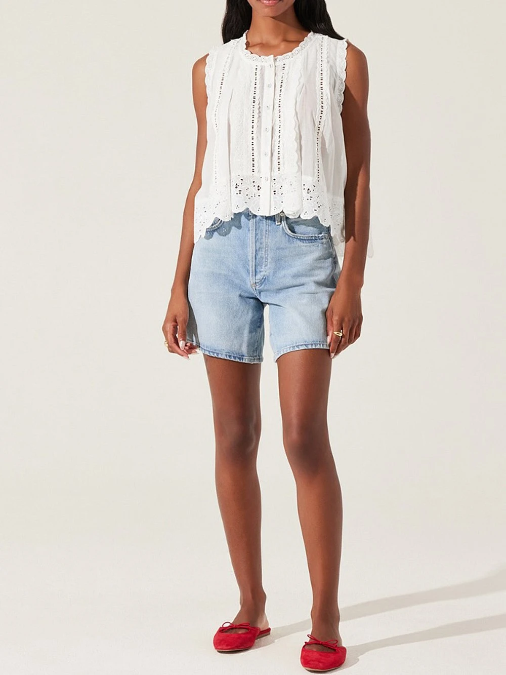 An allover scalloped trim and eyelet fabric are a sweet addition to this high-low hem, button-down tank.