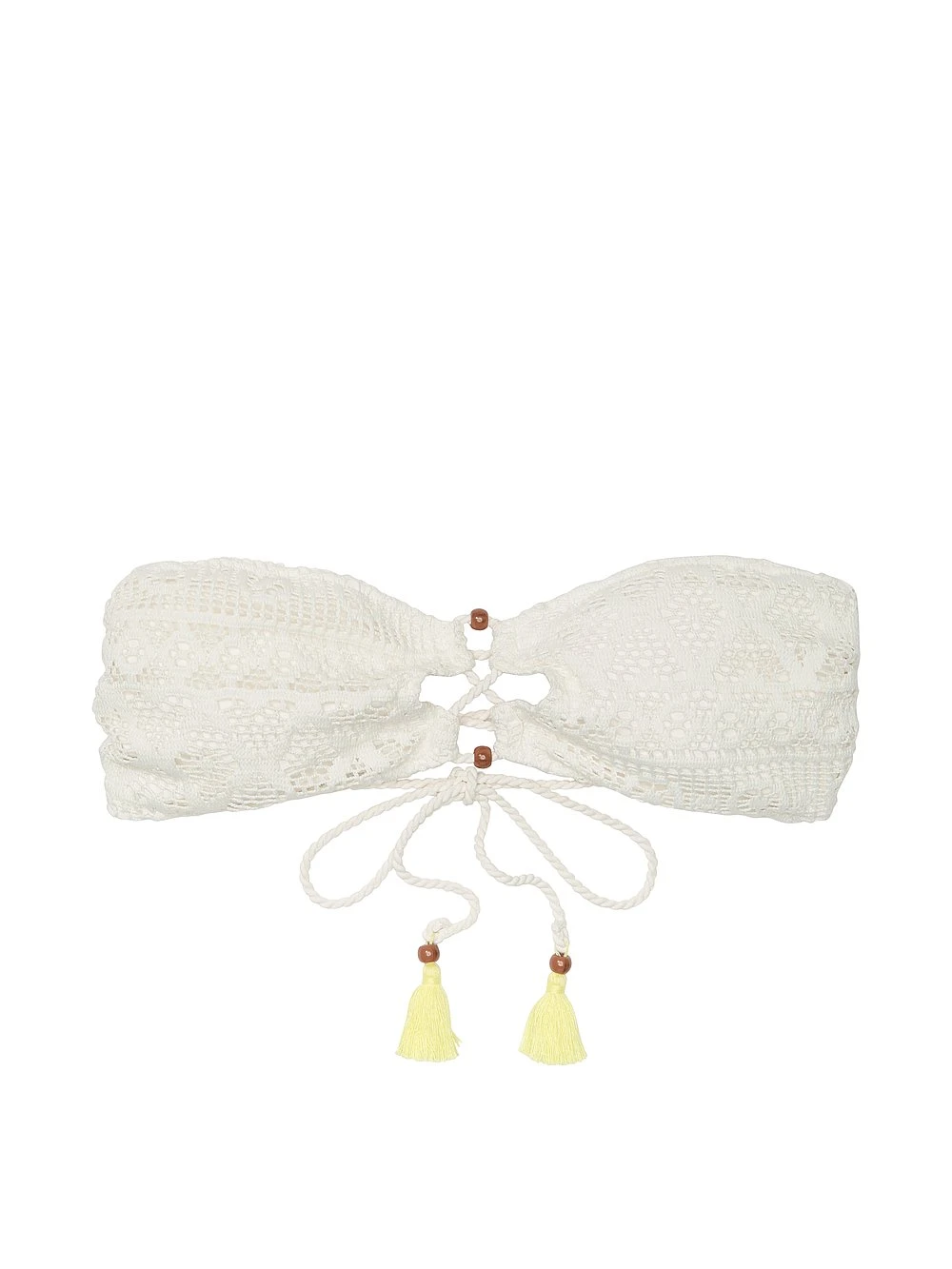 The allure of lace finds its place in the sun with this inspired collection. The lacy look is balanced with rope lace-up details, front and back. Beaded tassels add a chic island vibe to this reimagined Bandeau.