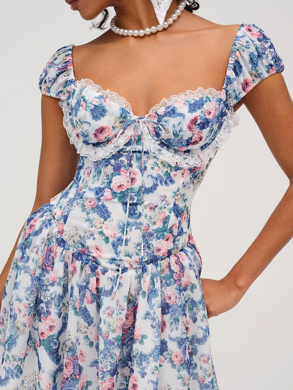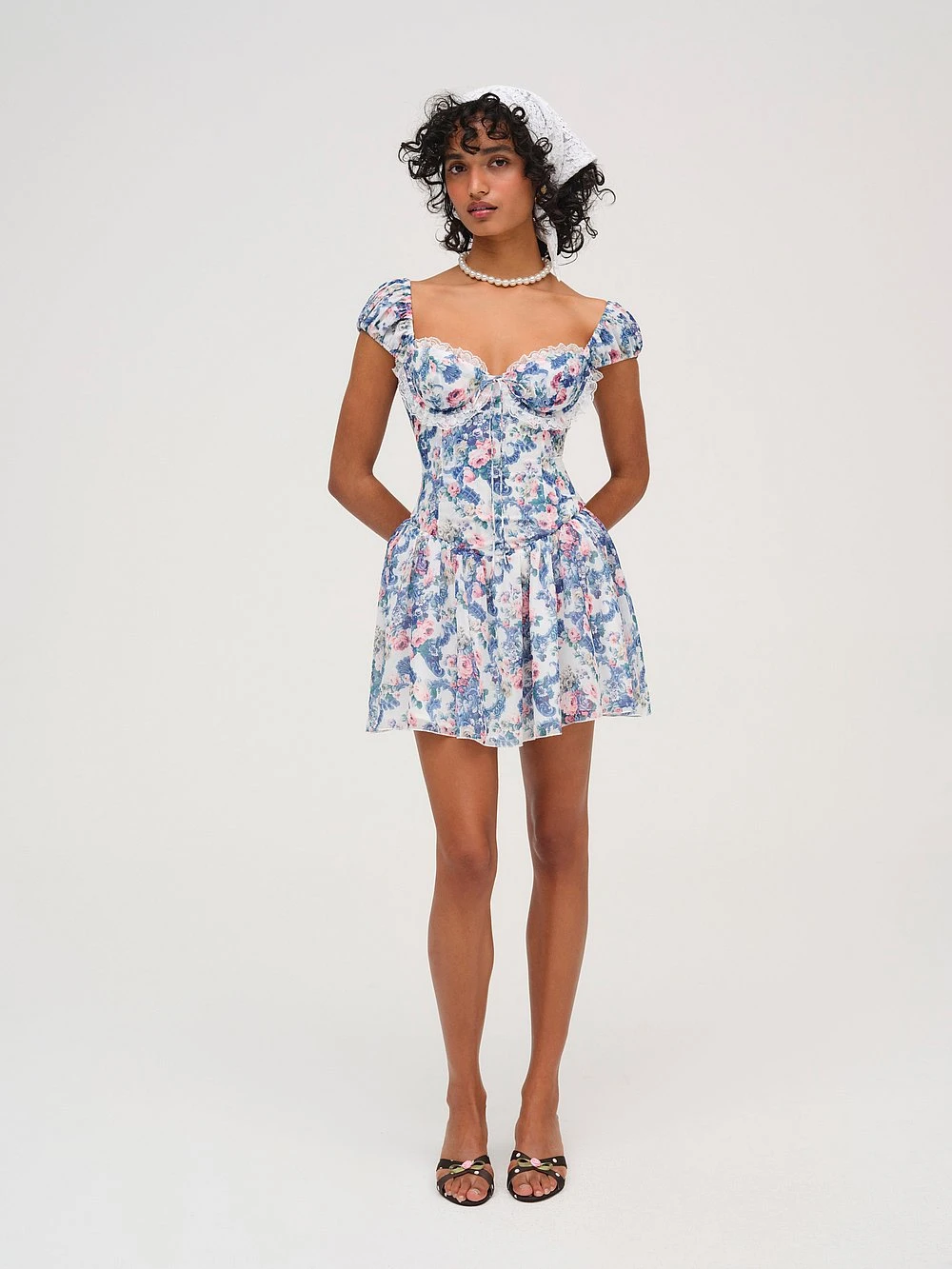 Spring into a new season with this romantic, corset-inspired Mini Dress. It’s adorned with lace trim and finished in an allover blue floral print with puffed cap sleeves and a fitted bodice.