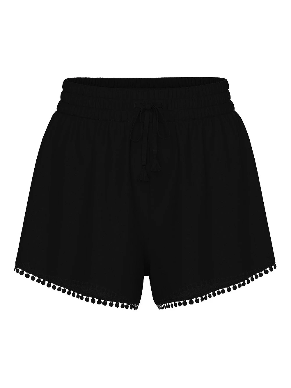 Decorative trim and a tasseled drawstring detail this short-and-sweet style, perfect for beach-to-brunch coverage.