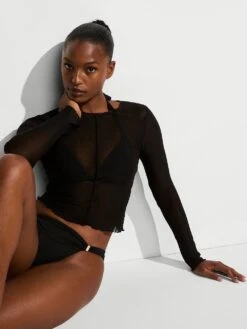 This breezy mesh Top adds a little sheer coverage over your swimsuit and makes for a chic going-out style when paired with a cute Bra and denim.