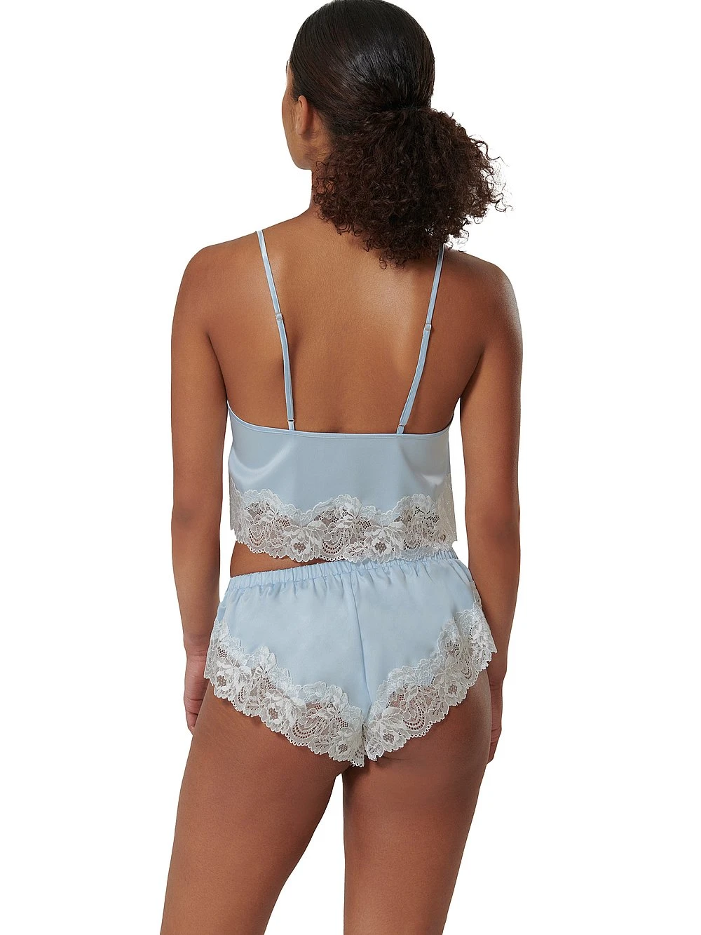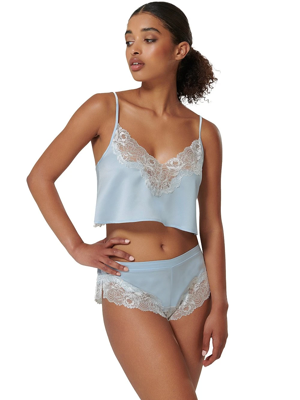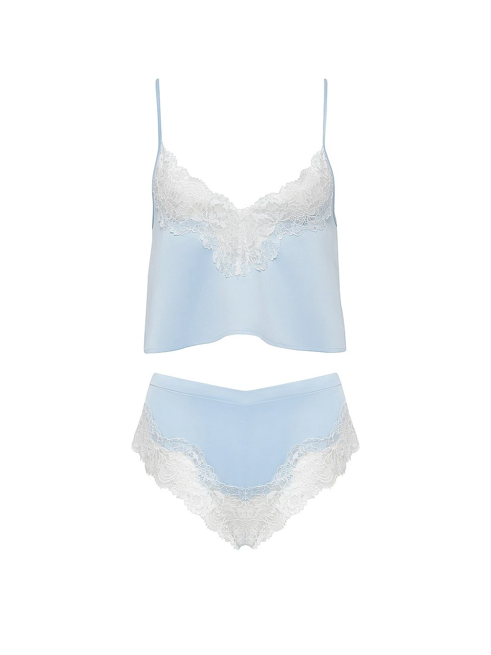 Elevate your evenings with this satiny-soft, sky-blue set that’s adorned with a delicate, floral lace trim.