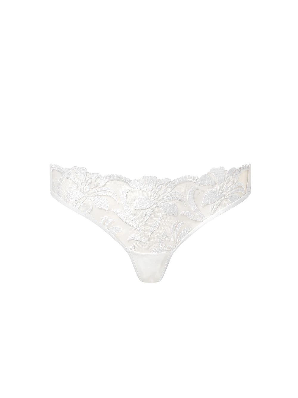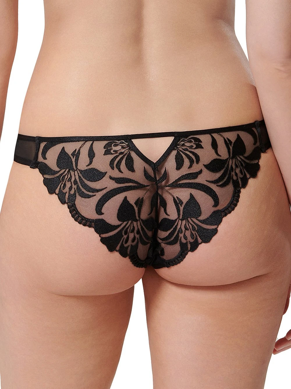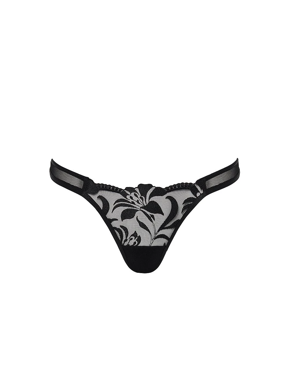Sweet, floral-inspired embroidery offsets semi-sheer mesh on this style that has been constructed with a wide side strap for added comfort.