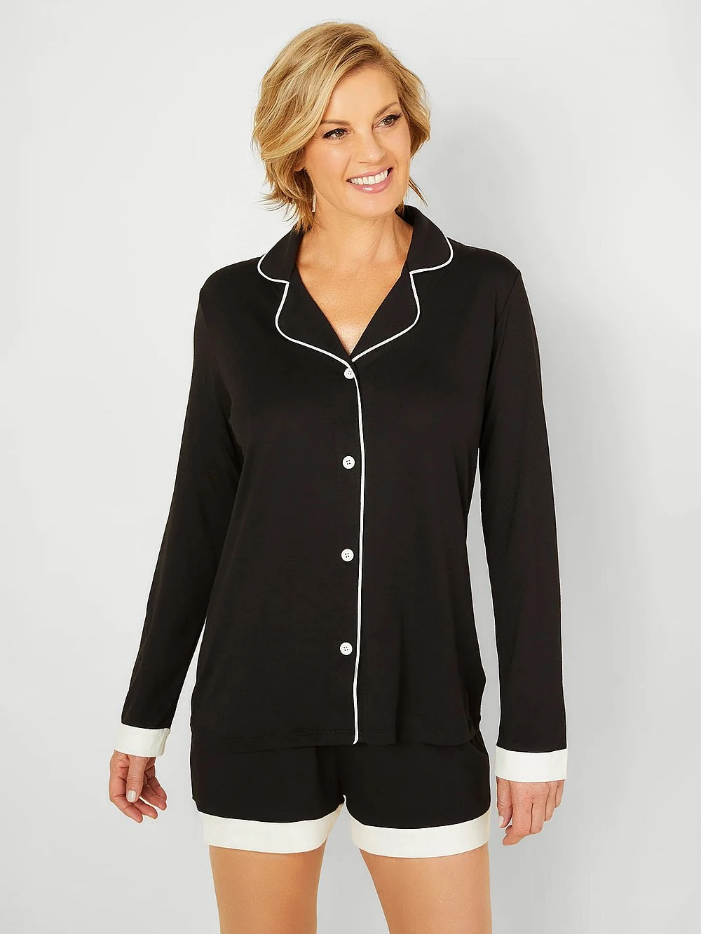Not too hot, not too cold—you’ll lounge just right in this comfy, two-piece set that’s crafted from a buttery-soft, Peruvian Pima cotton-modal blend. A contrasting piped seam and hem detail adds a chic touch.