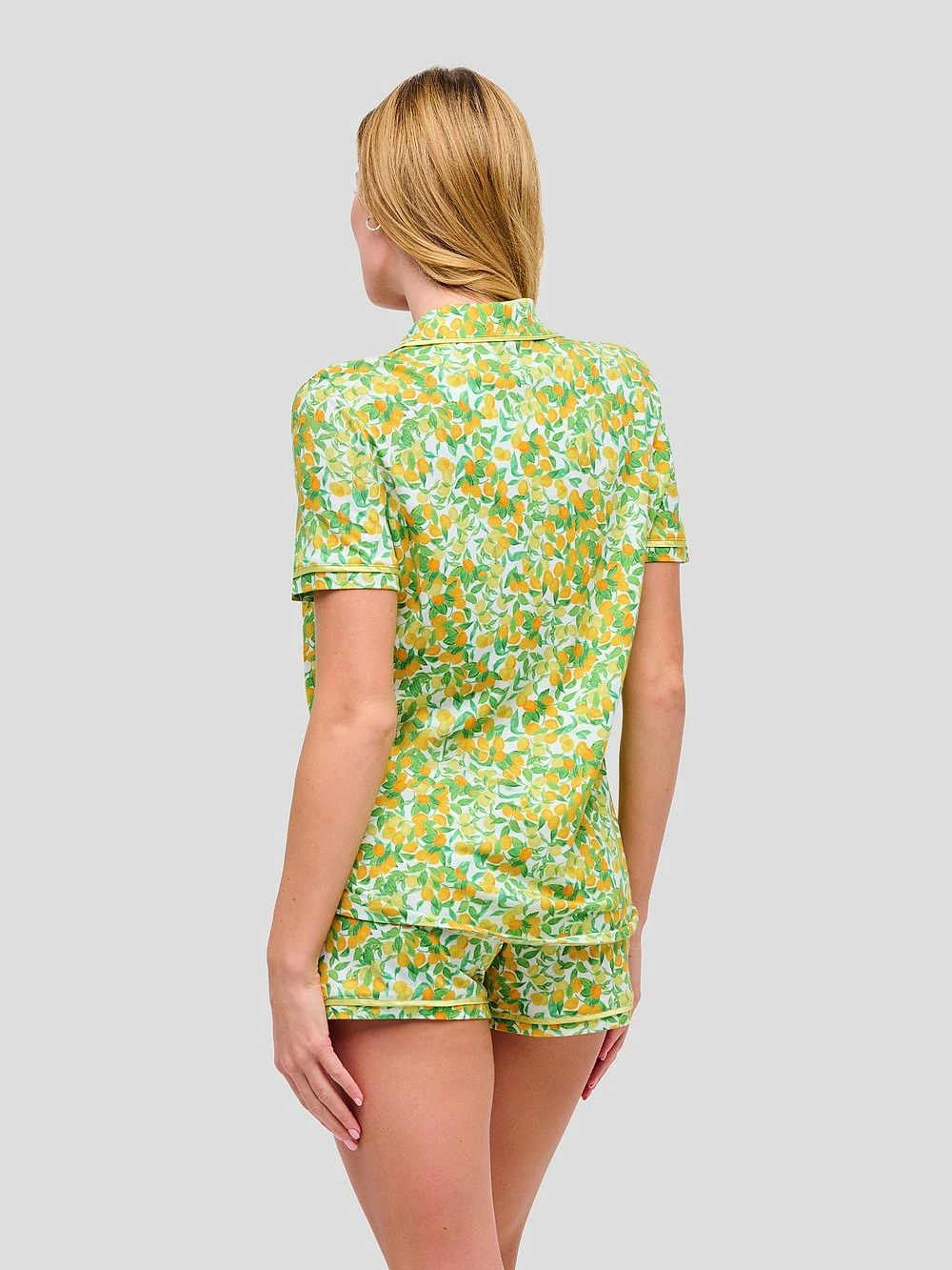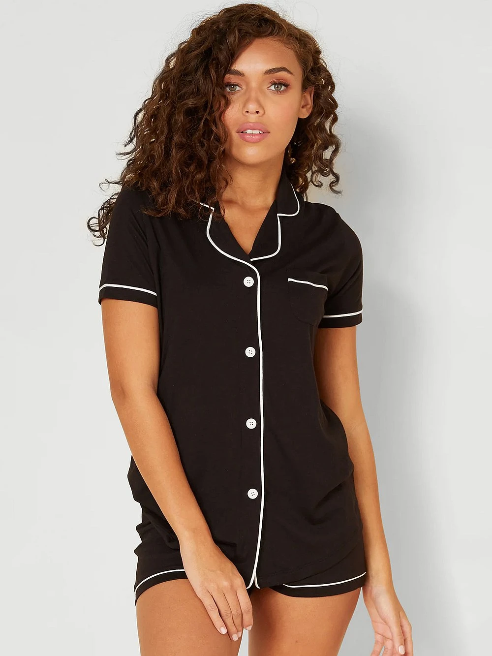 - Top: short sleeve, button-front closure, chest patch pocket, lapel collar