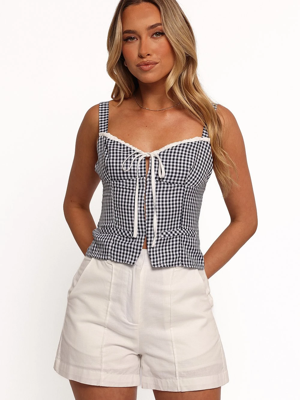 - Front cutout with self-tie detail