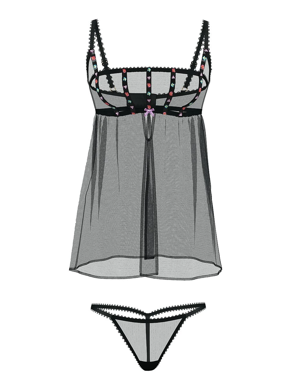Romance blossoms in an array of moody blooms embroidered on sheer tulle mesh on this barely there—but undeniably striking—Set.