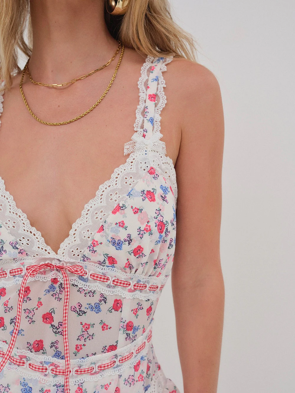 - Slotted gingham ribbon accents with self-tie detail