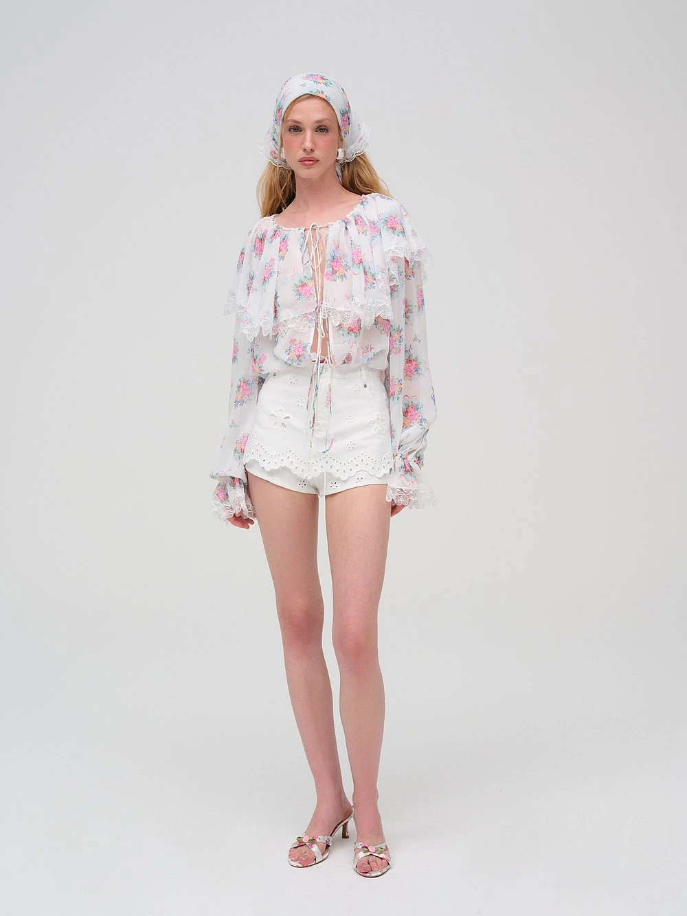 Add some romance to your life in this Top, rendered in a sweet floral printed chiffon. It’s decorated with an ethereal ruffled collar with lace trim, elasticized billowy sleeves and functional, center front ties for a laid-back, wear-everywhere look.