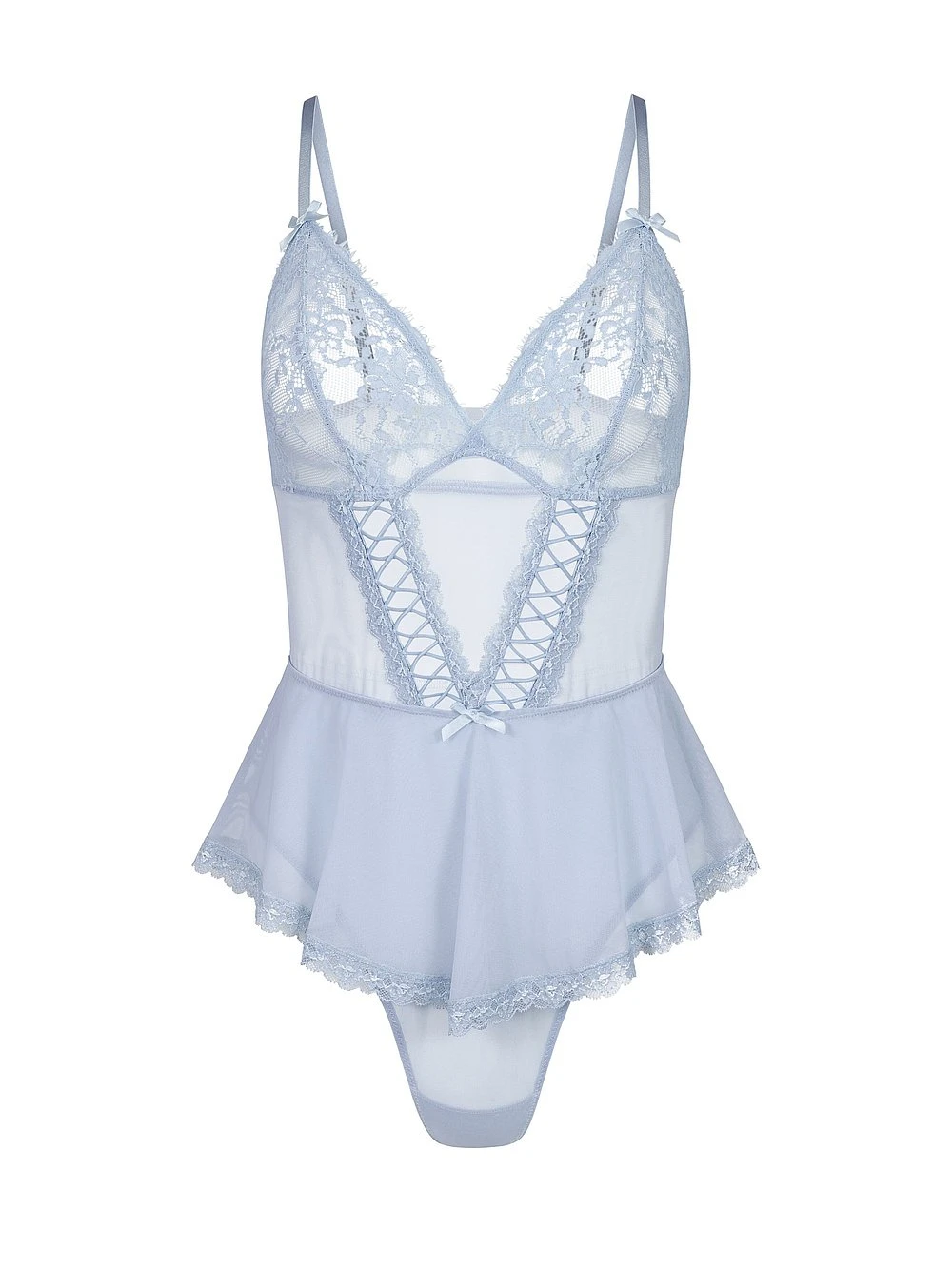 This sexy silhouette is crafted from glamorous, sheer mesh and features daring, unlined triangle cups. A sweet, peplum skirt adds a feminine finish.