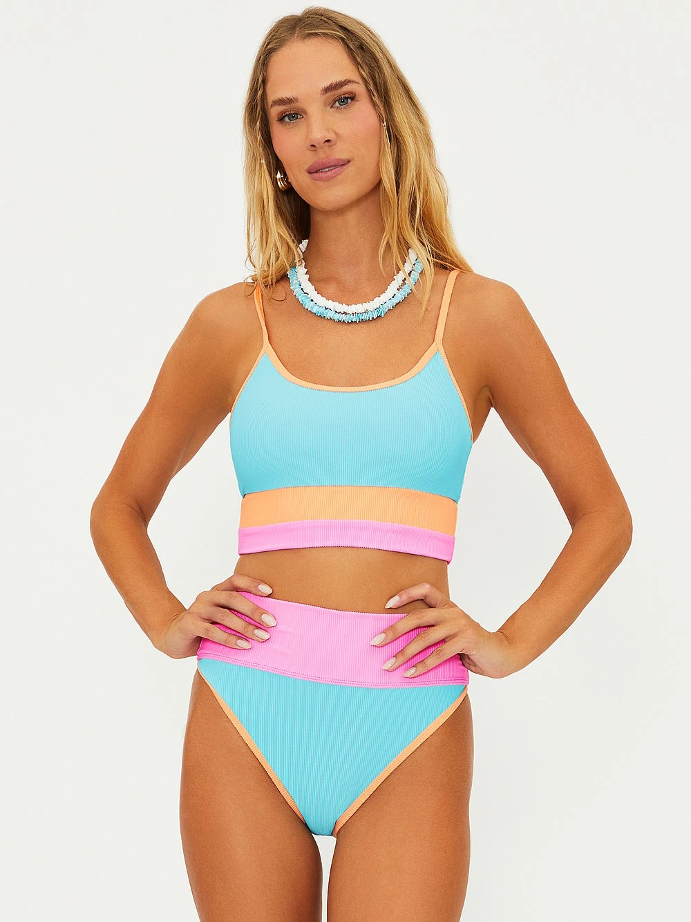 You’ll love the fit of this sporty, high-waisted Bikini Bottom featuring bold colorblocking. Pair with the matching Eva Top.