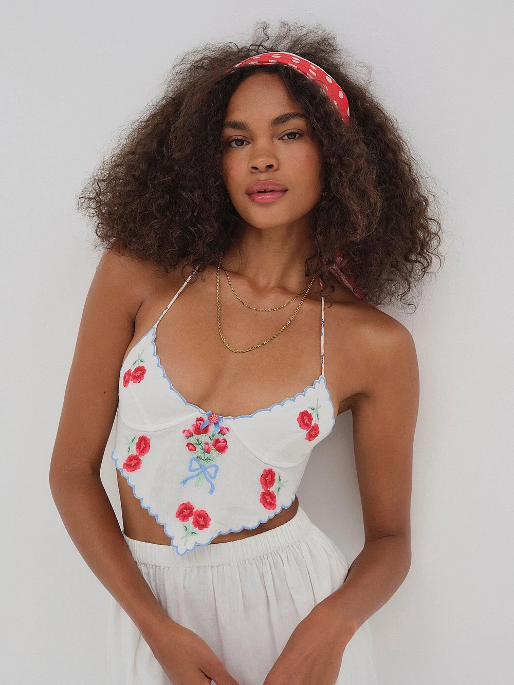 This muse-worthy, 100% cotton, handkerchief-style silhouette is adorned with sweet floral embroidery, scalloped trims, and finished with a daisy-topped, satin bow applique. Pair with the matching Forget Me Not Bloomer Panty and midi Skirt for a coordinated look that’s brimming with romance.