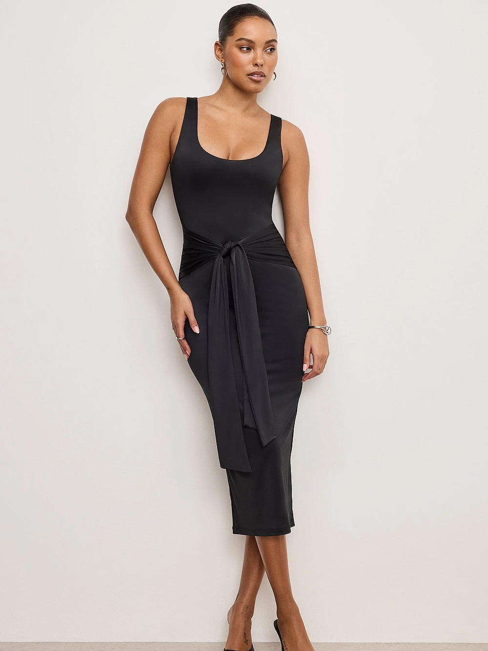 Slinky and sexy, this jersey midi dress has just the right amount of ruching, making it a versatile piece for any occasion.