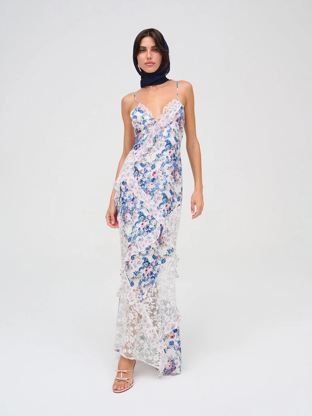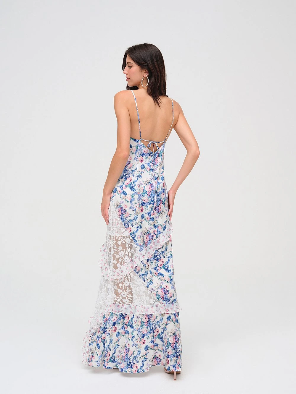 A patchwork of spring-ready florals, lacy details, and ruffle finishes combine to create an oh-so-romantic silhouette on this ultra-feminine maxi Dress. A V-neckline and back-tie detail add an extra hint of sweetness.