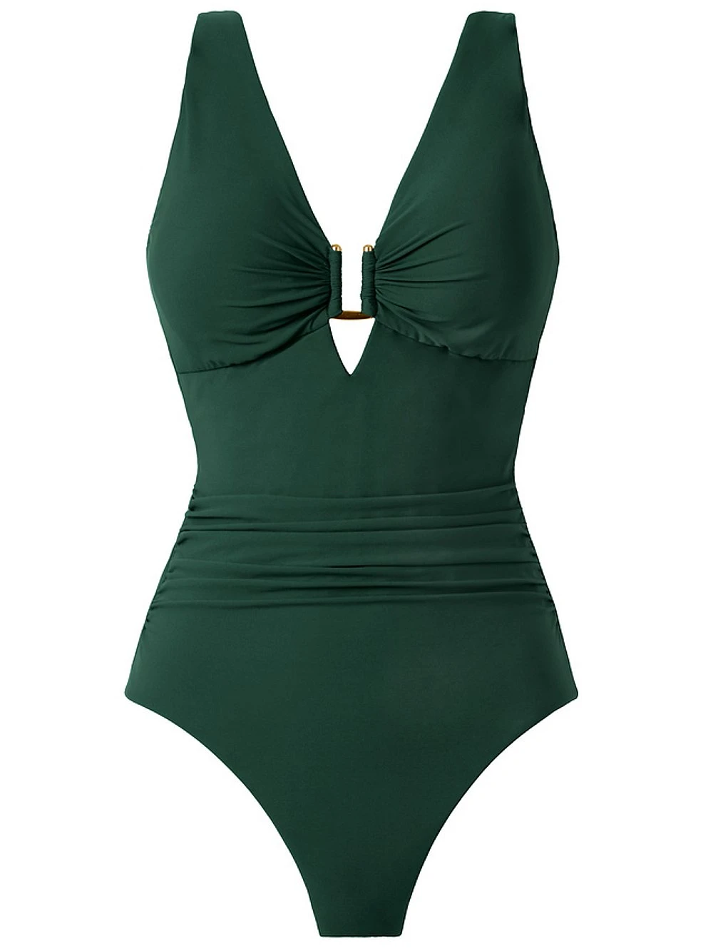This chic and supportive suit features a built-in, soft cup Bra that can accommodate up to a D cup. U-shaped hardware detailing adds a glamorous finish to a plunging, V-neckline.