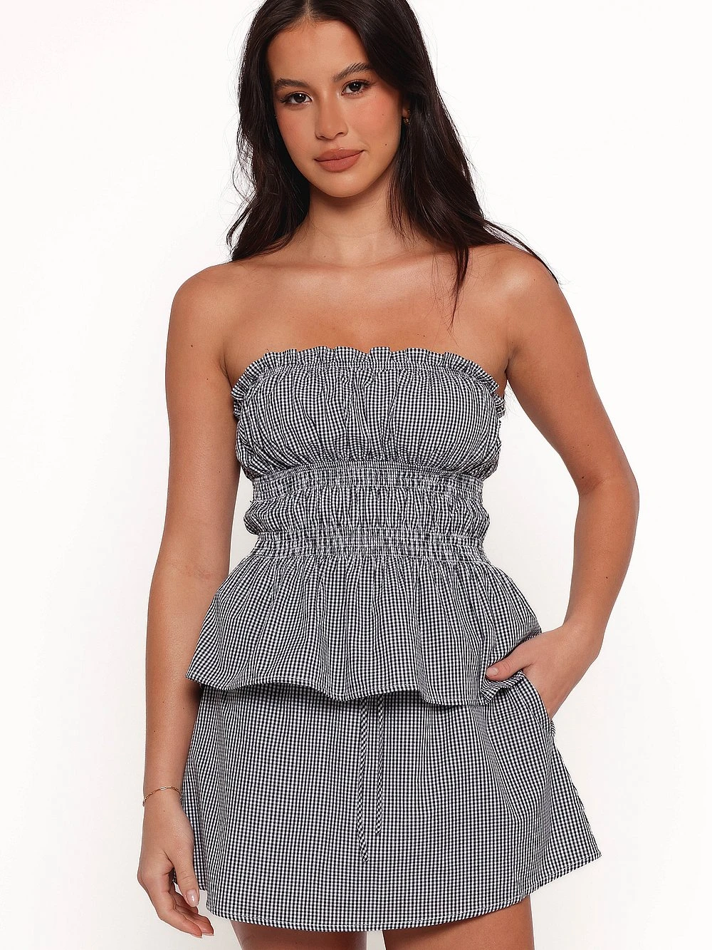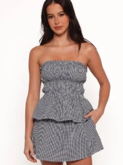 Summer’s latest “it” duo? This 100% cotton, two-piece set in a sweet gingham pattern. Featuring a chic Top in a romantic, peplum silhouette plus, a sweet and breezy mini Skirt.
