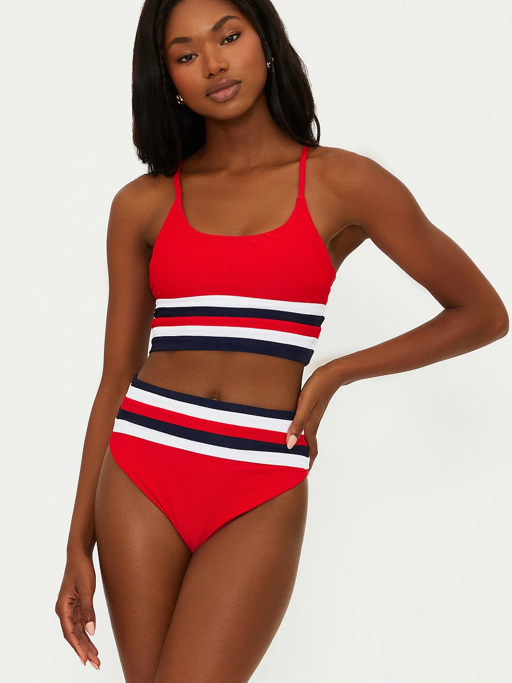 Cool color blocking details add a retro feel to this longline style that features a flattering scooped neckline. Pair with the Millie Bottom for the full look.