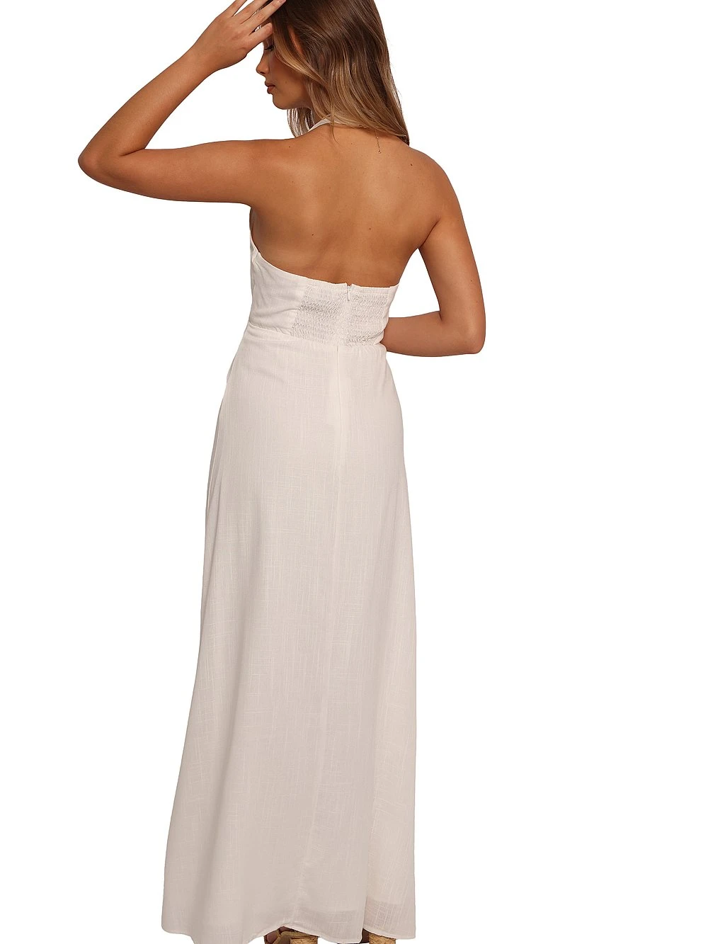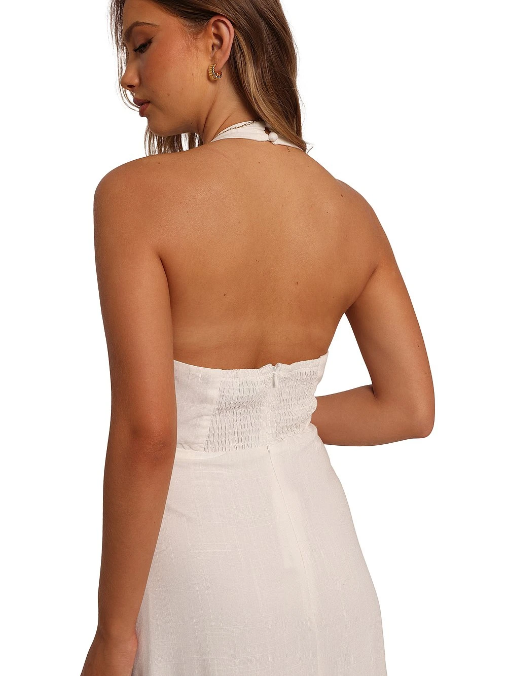 A deep V-neckline adds a flirty finish to this flattering and curve-hugging halter maxi Dress. A button closure ensures a secure fit, while a shirred back panel means you’ll spend your soirée in comfort.