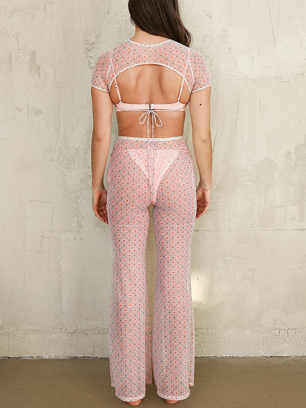 The perfect cover-up for your favorite bathing suit, these flowy mesh Pants have an elastic waistband and flared legs with an allover print.