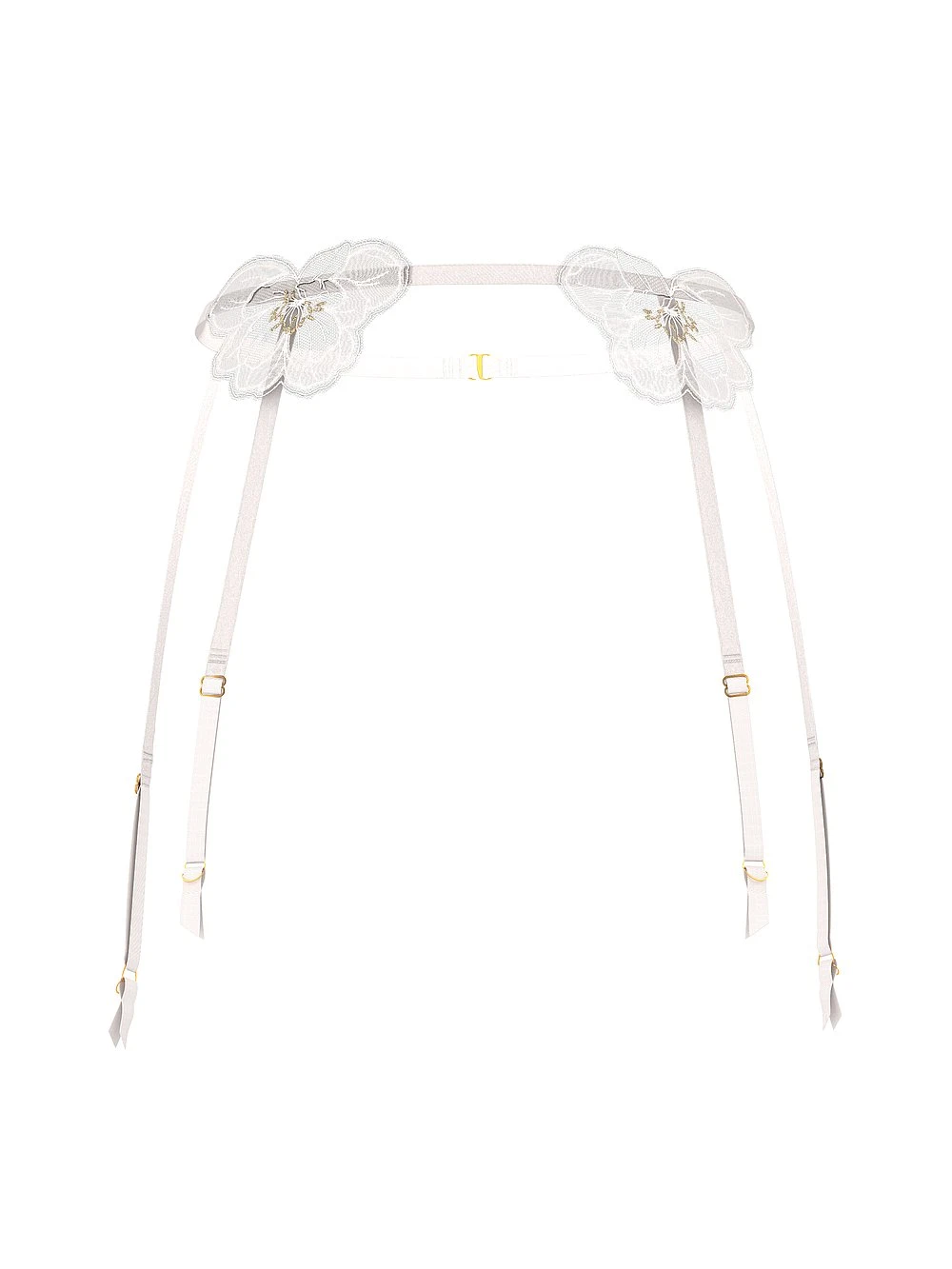 Celebrate your big day—and beyond—right down to your Lingerie. Designed in Switzerland, stunning peony embroidery is centered with shimmery metallic threads for a glamorous effect on this elegant Garter Belt.