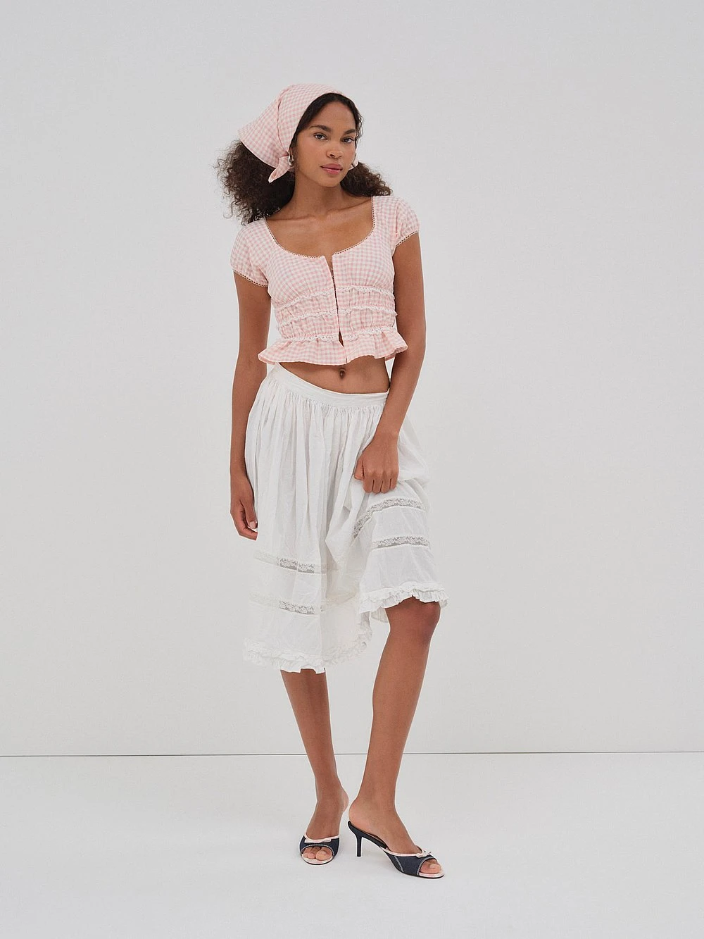 Rendered in a pretty textured pink gingham fabric, this Top is made for a vacation. It has cap sleeves, a ruched body, and lace trim.