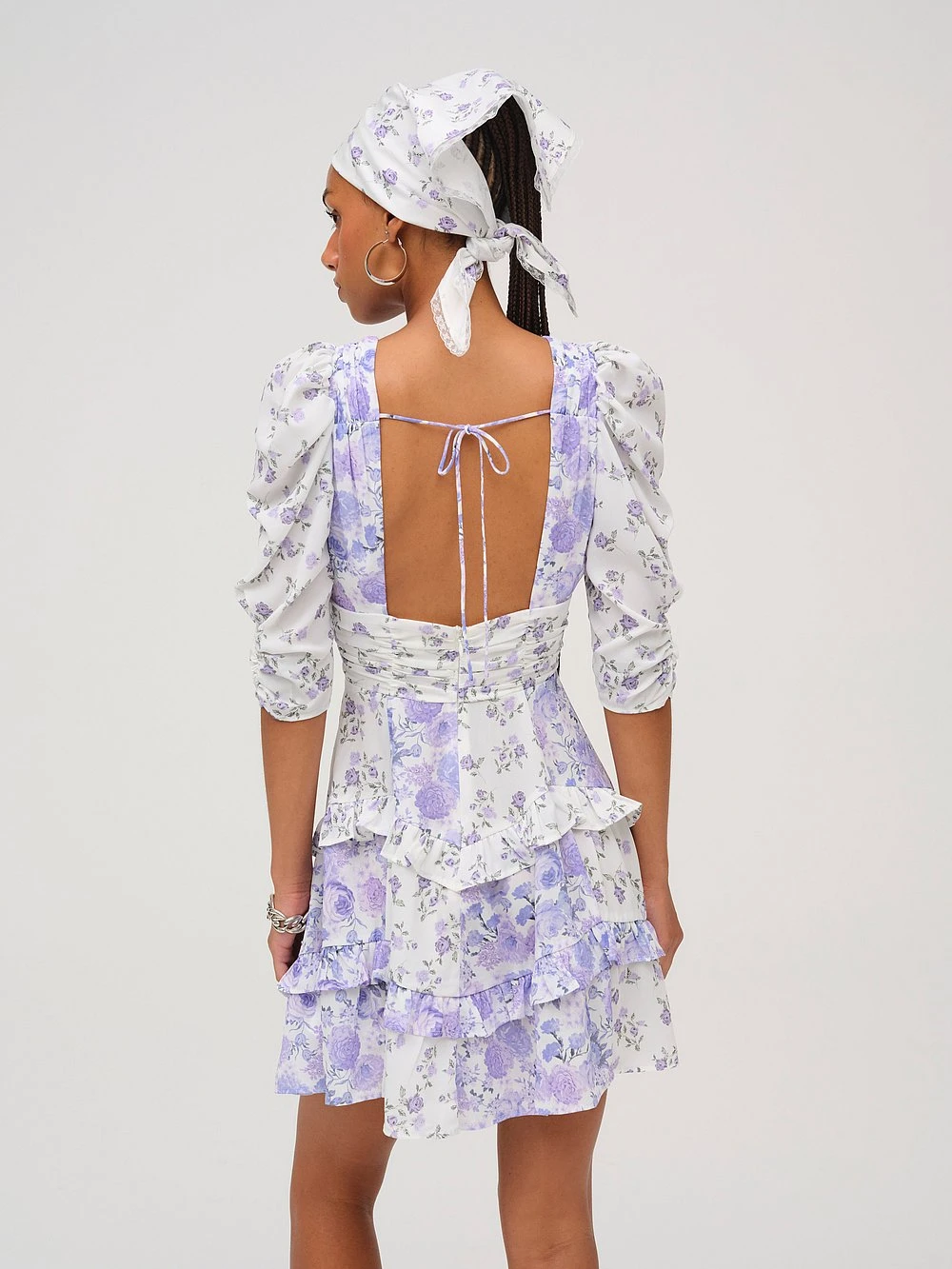 A nod to the bohemian Dress (and dreams) of the ‘70s, this spring favorite features pastel patchwork florals, puff sleeves, and a paneled handkerchief hem with ruffled finishes.