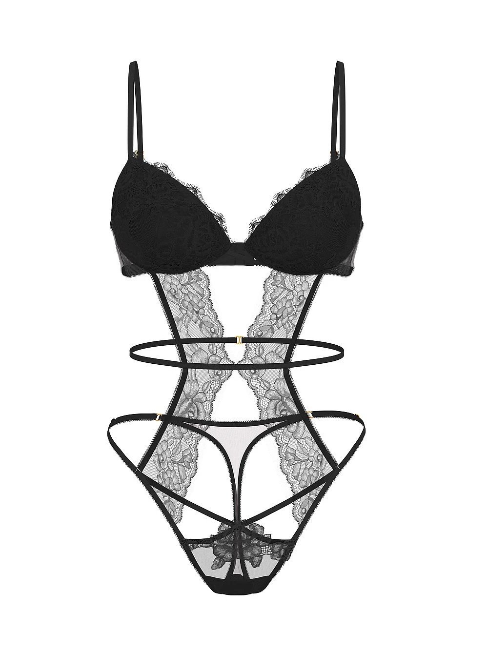 Our sophisticated rose lace gets a little racy with dramatic cutouts and sexy straps on this lightly padded one-piece.