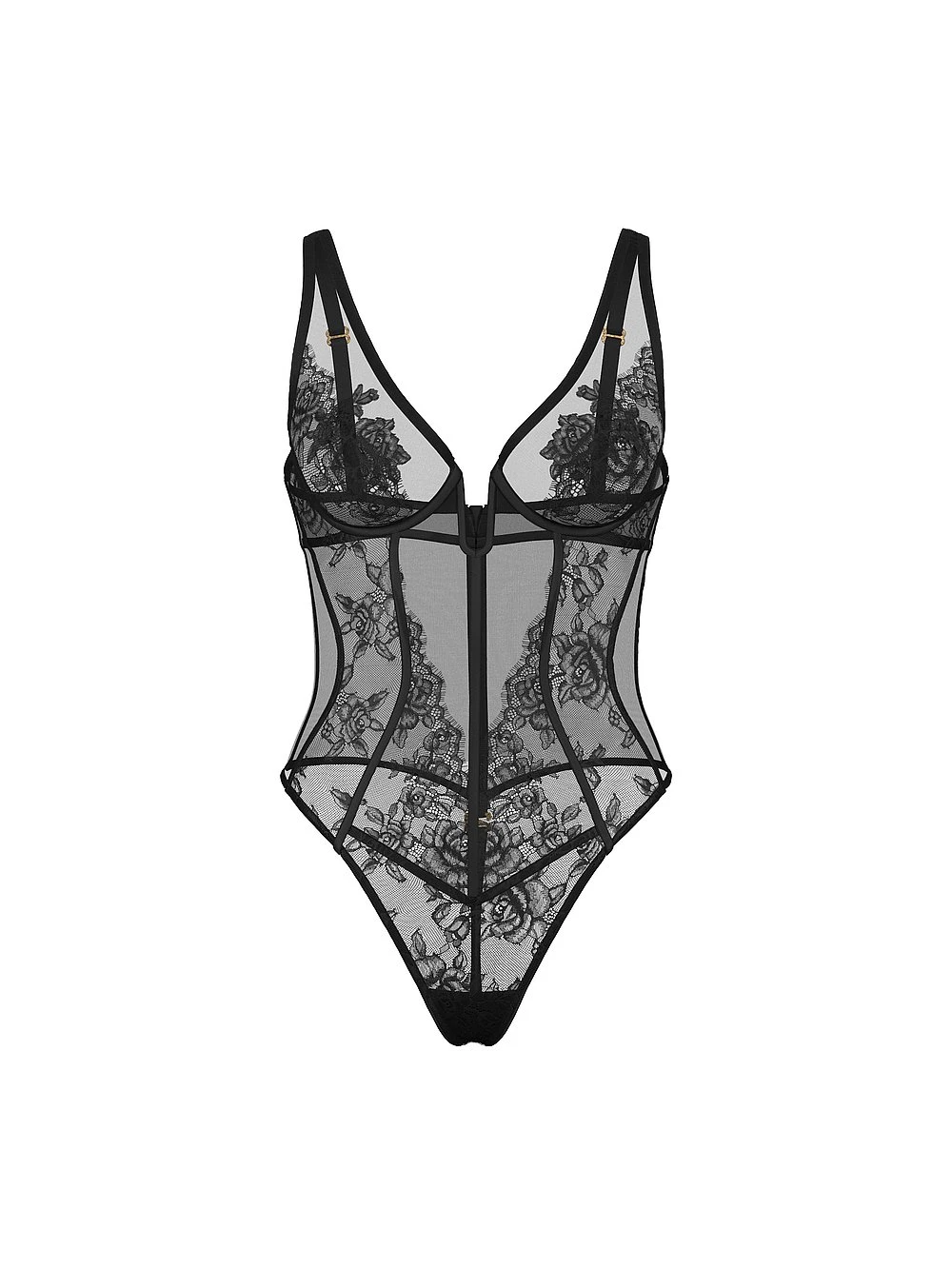 - Sheer demi cups with placed lace appliques for coverage