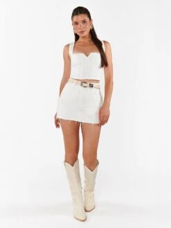 A gently distressed hem exudes an effortlessly lived-in look on this versatile cotton staple. Love to coordinate your outfits? Pair with the Crossroads Corset Top.