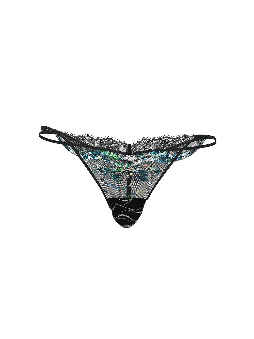 Shimmery printed sequins and colorful embroidery evoke a dreamy, wave-like pattern for a magical, mythical effect worthy of a modern siren. A touch of rose lace elevates this V-String Panty.
