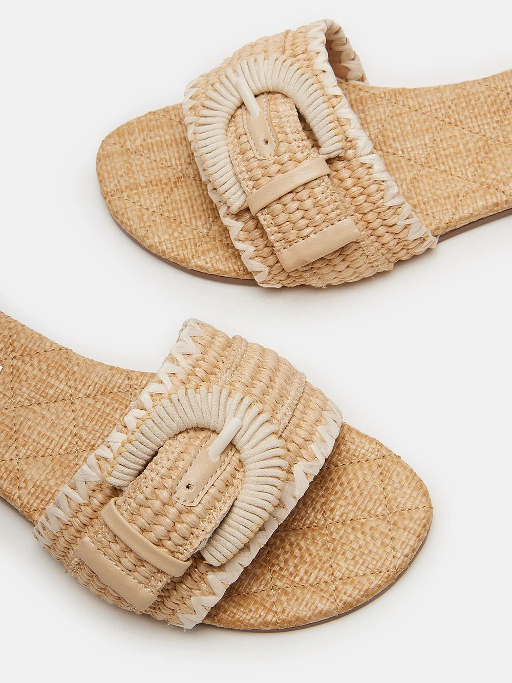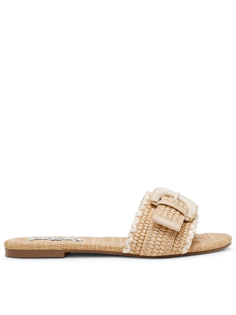 The MERLA flat slide sandal is designed for both style and comfort. The decal on the strap adds a touch of elegance to your step. Perfect for any occasion, these sandals offer the perfect balance of fashion and functionality.