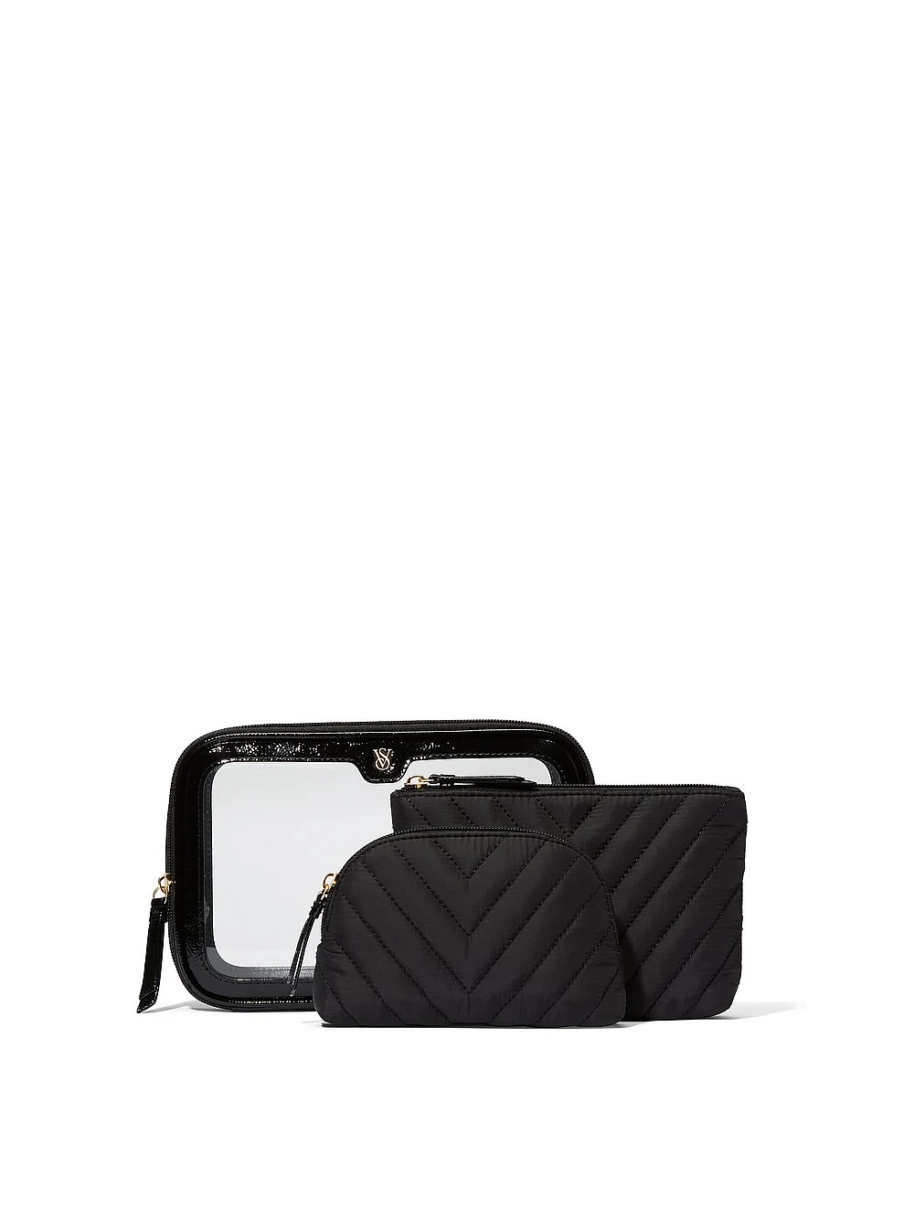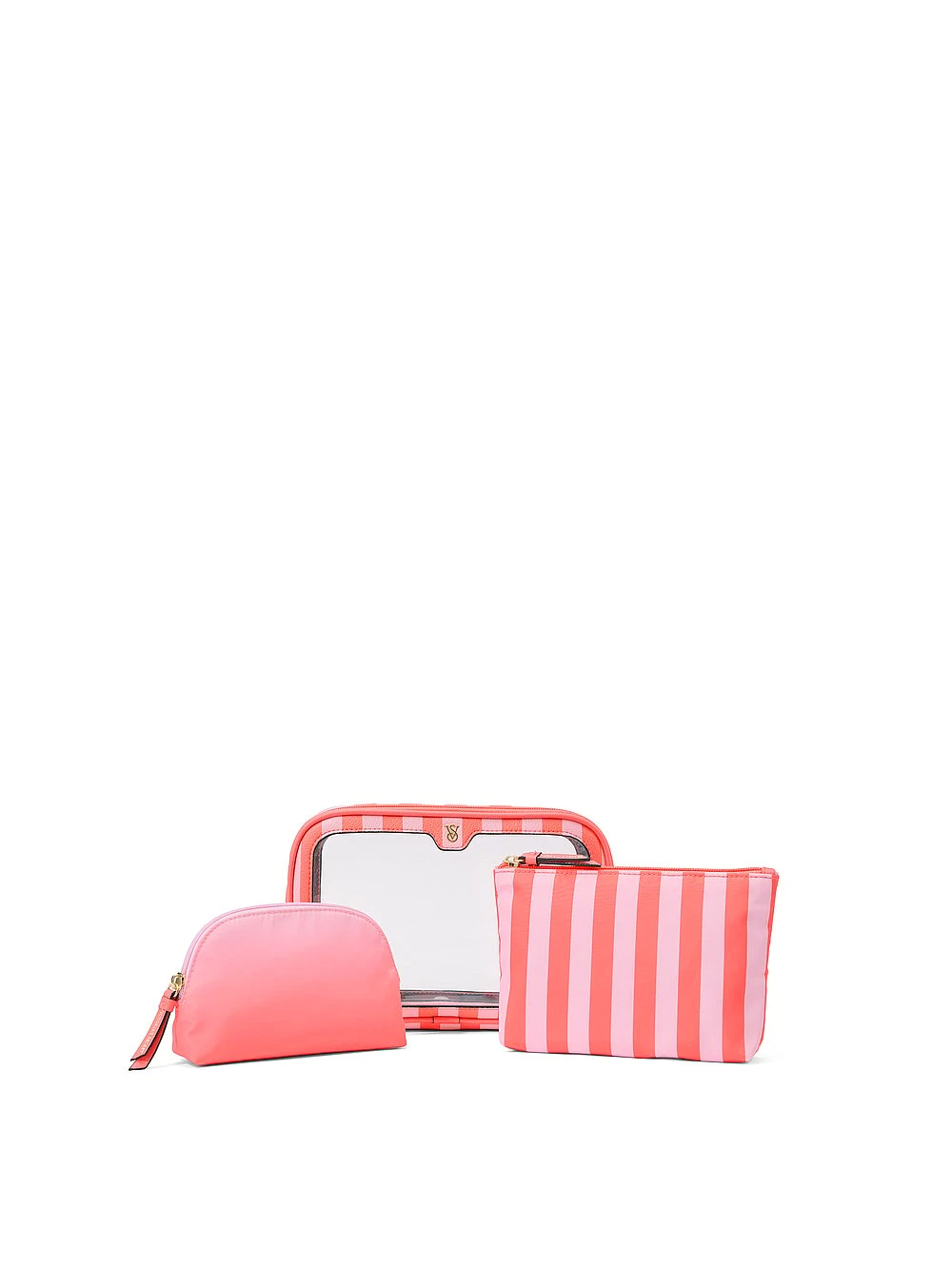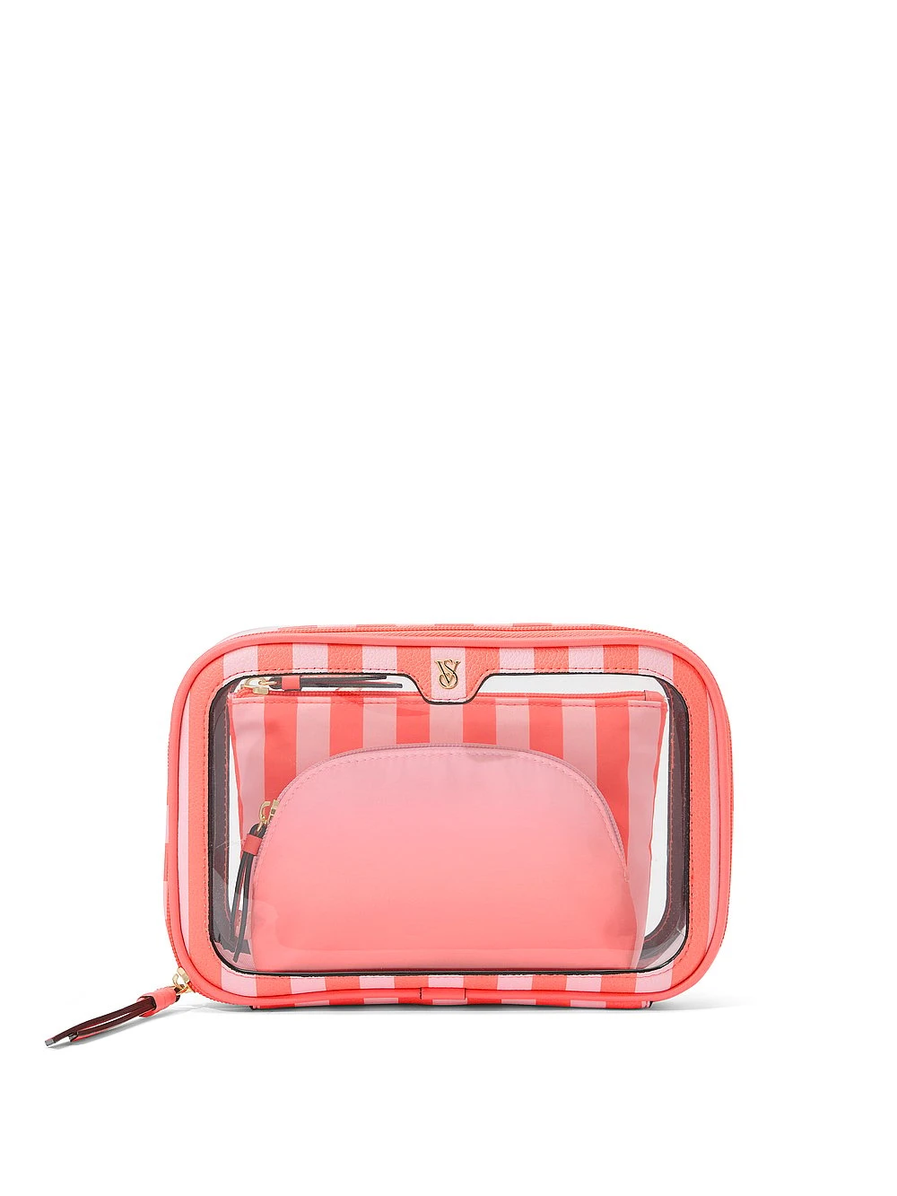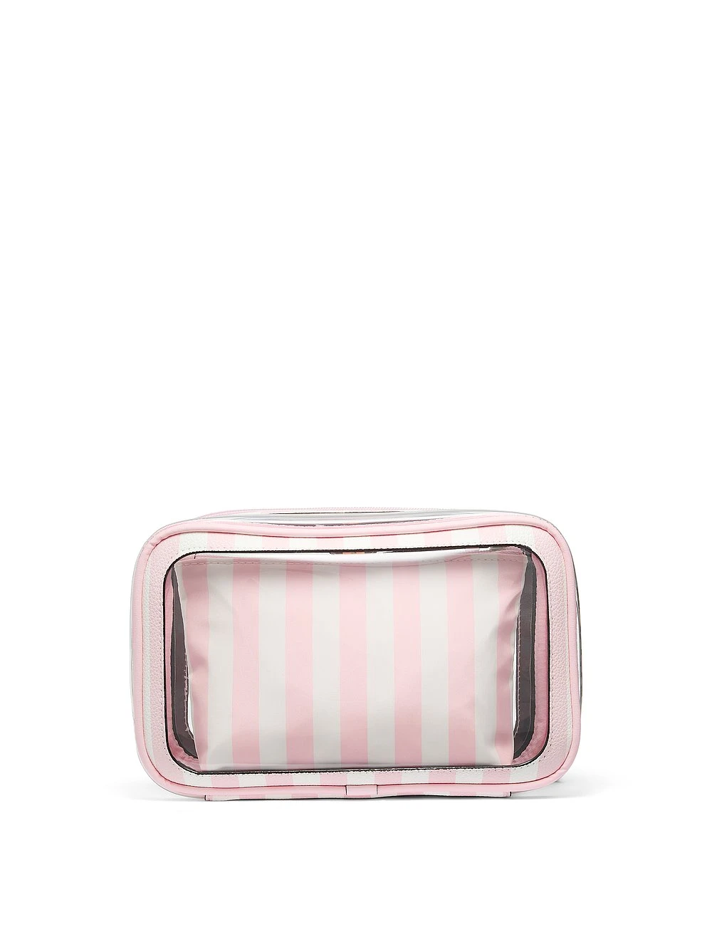 Here comes the glam. This iconic stripe trio fits everything you could ever need and the clear exterior helps you quickly find what you’re looking for. Features a beautiful bridal embroidery to celebrate your special day.