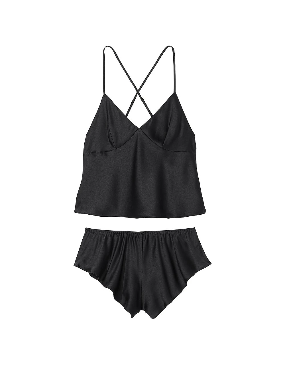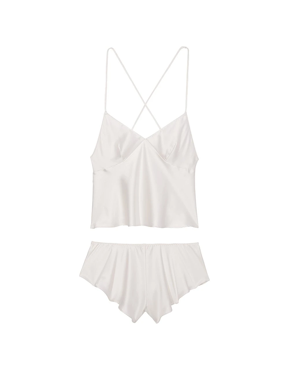 Flyaway styling in back of the camisole adds movement and intrigue. Fluttery shorts complete the look.