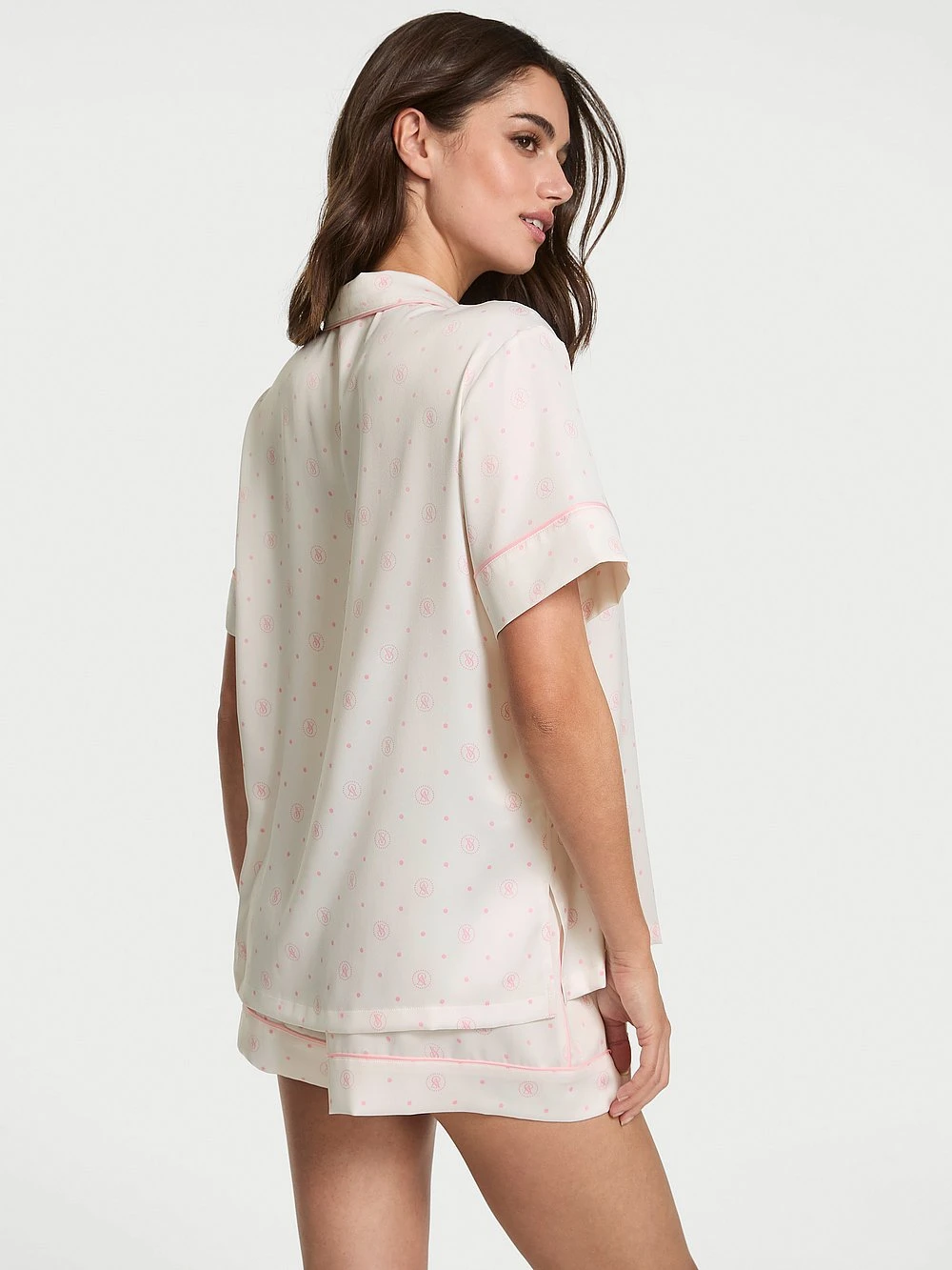 et your beauty sleep in our glossy set featuring a short-sleeve button-up and matching shorts. Finished with a chest pocket, notch collar, and decorative piping.