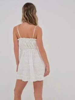 Dreamy, Swiss-designed embroidery with a distinctive boho vibe swirls across sheer mesh on top of this unique Babydoll. At the ruffled skirt, light, flowy fabric with a fanciful floral print feels feminine and fresh.