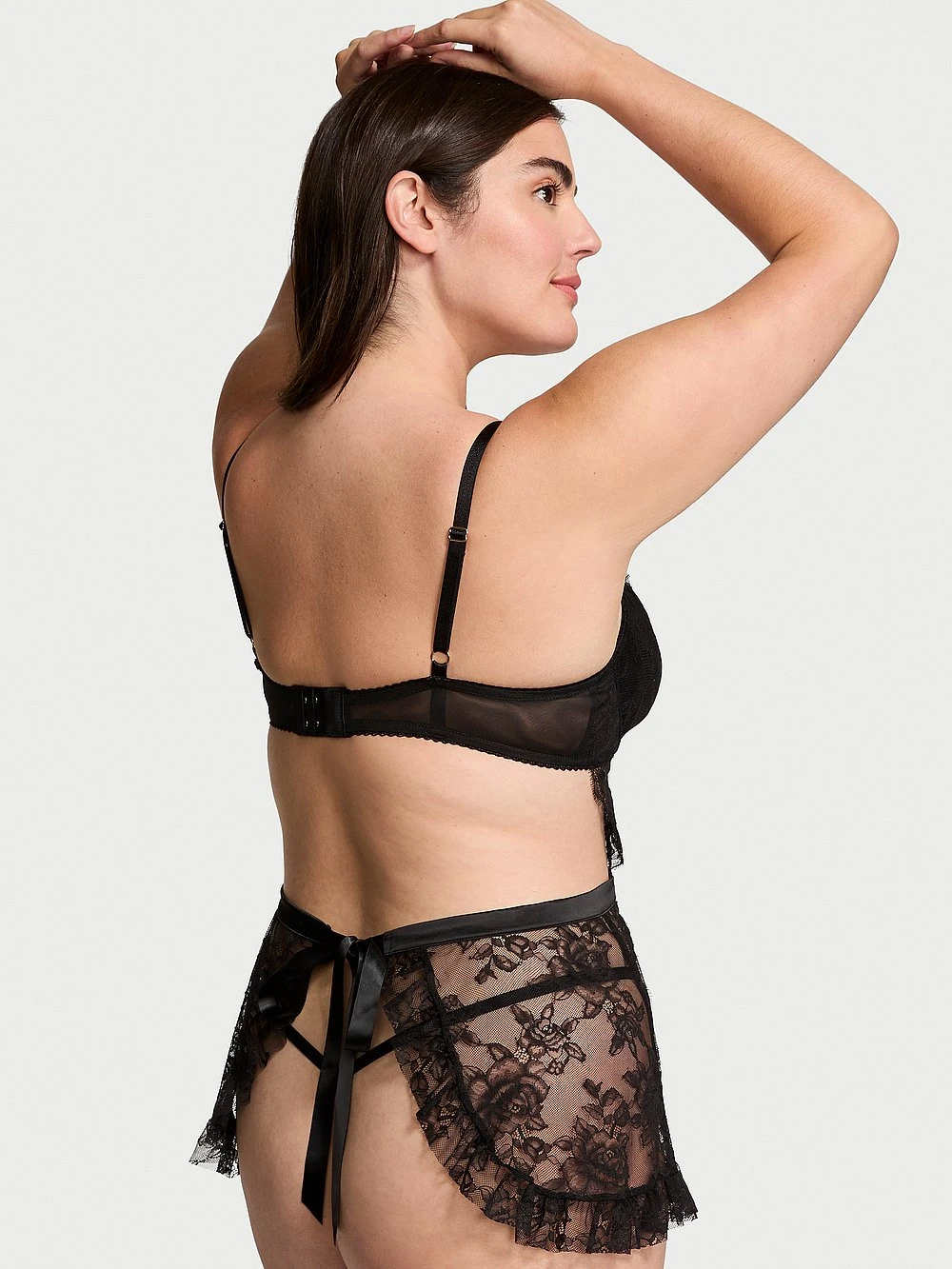 This flirty apron style turns up the heat with our romantic rose lace topped with a bow. Secured with a satin sash in back and paired with the matching Thong Panty, it’s sheer perfection.